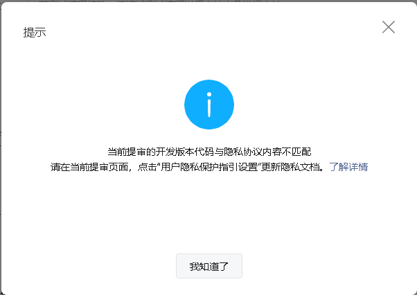 你好,一般是小程序当前提审版本隐私项与现网版本隐私项不一致,建议排查当前提审版本是否新增隐私项未补充,并根据弹窗提示入口补充隐私协议内容,详情可参考:https://developers.weixin.qq.com/miniprogram/dev/framework/user-privacy/