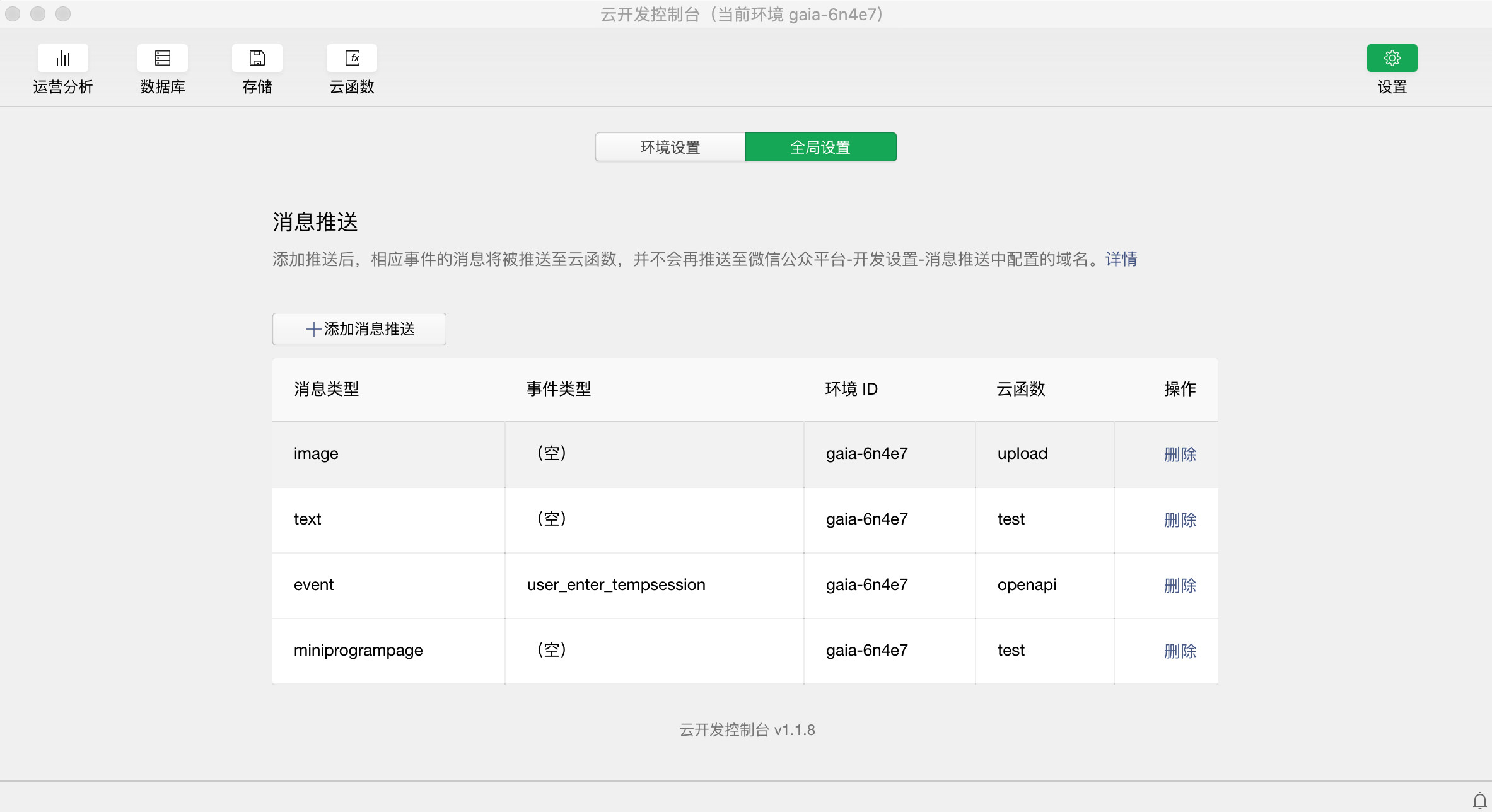 小程序·云开发支持通过云函数接收小程序消息推送(如接收到客服消息时触发云函数)。开发者可在云控制台设置页面的全局设置中添加相关消息推送的配置,具体接入方式见 消息推送
