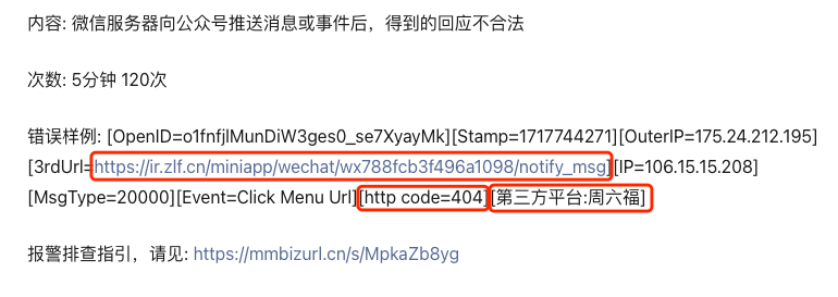 错误样例: [OpenID=o1fnfjlMunDiW3ges0_se7XyayMk][Stamp=1717744271][OuterIP=175.24.212.195][3rdUrl=https://ir.zlf.cn/miniapp/wechat/wx788fcb3f496a1098/notify_msg][IP=106.15.15.208][MsgType=20000][Event=Click Menu Url][http code=404][第三方平台:周六福]