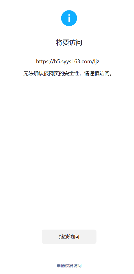 您好,域名(https://h5.syys163.com/ljz/)域名在腾讯云注册并备案通过,申请恢复也没用。服务器也在腾讯云,浏览器访问正常,我是网站开发者,访问时间如图微信访问网站出现“无法确认该网页的安全性,请谨慎访问”,经检查网页里没有不安全的内容,请核实后帮忙解除拦截,谢谢!