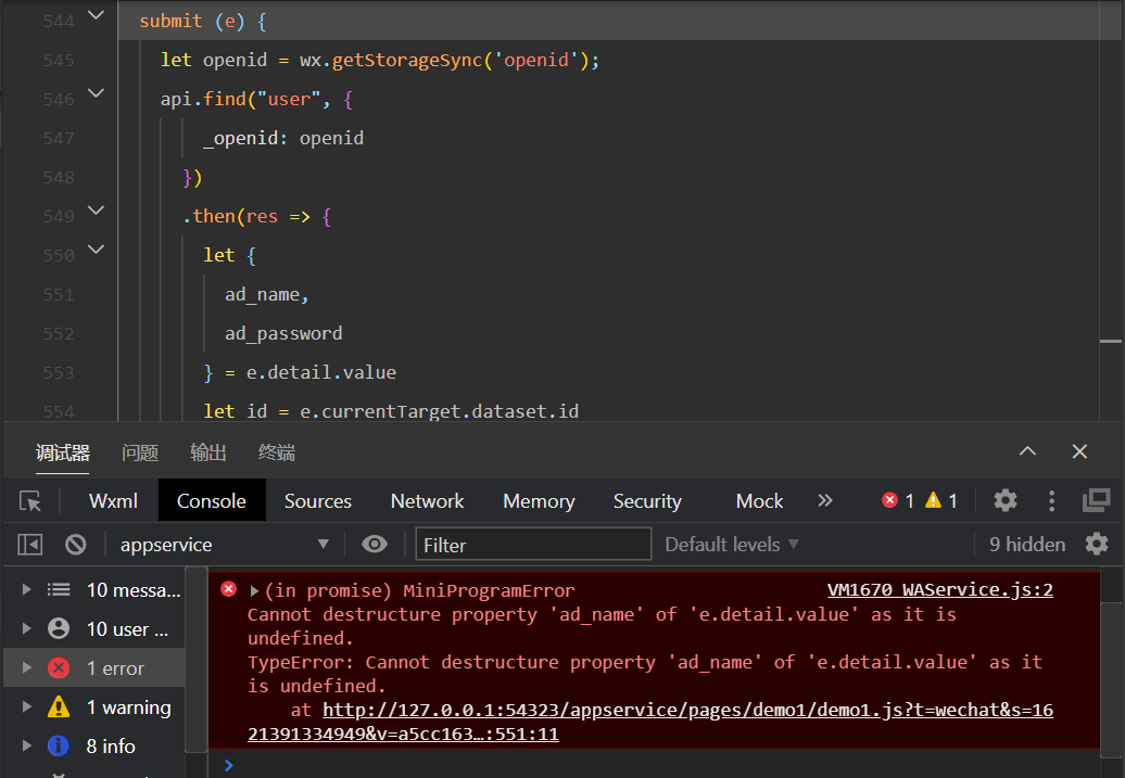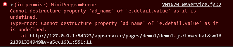 TypeError: Cannot destructure property 'ad_name' of 'e.detail.value' as it is undefined.