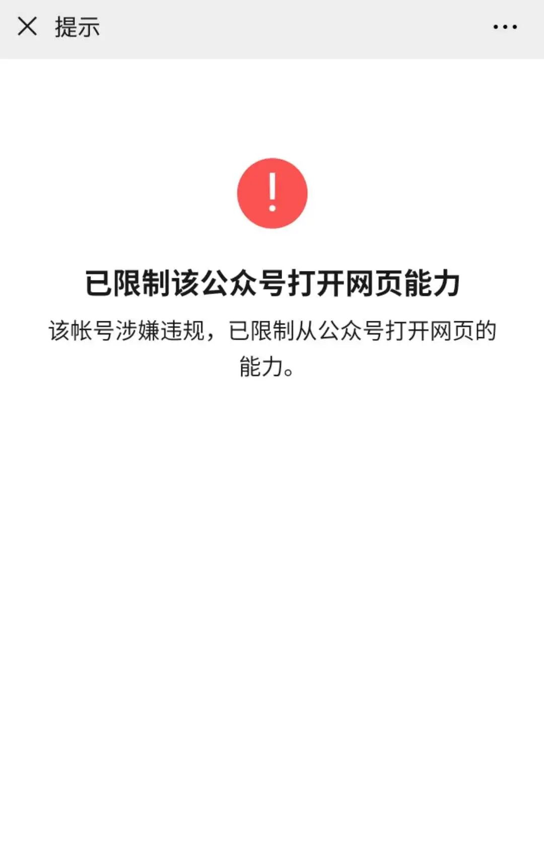 在定义菜单后,通过菜单打开网页,提示“已限制该公众号打开网页能力”。
