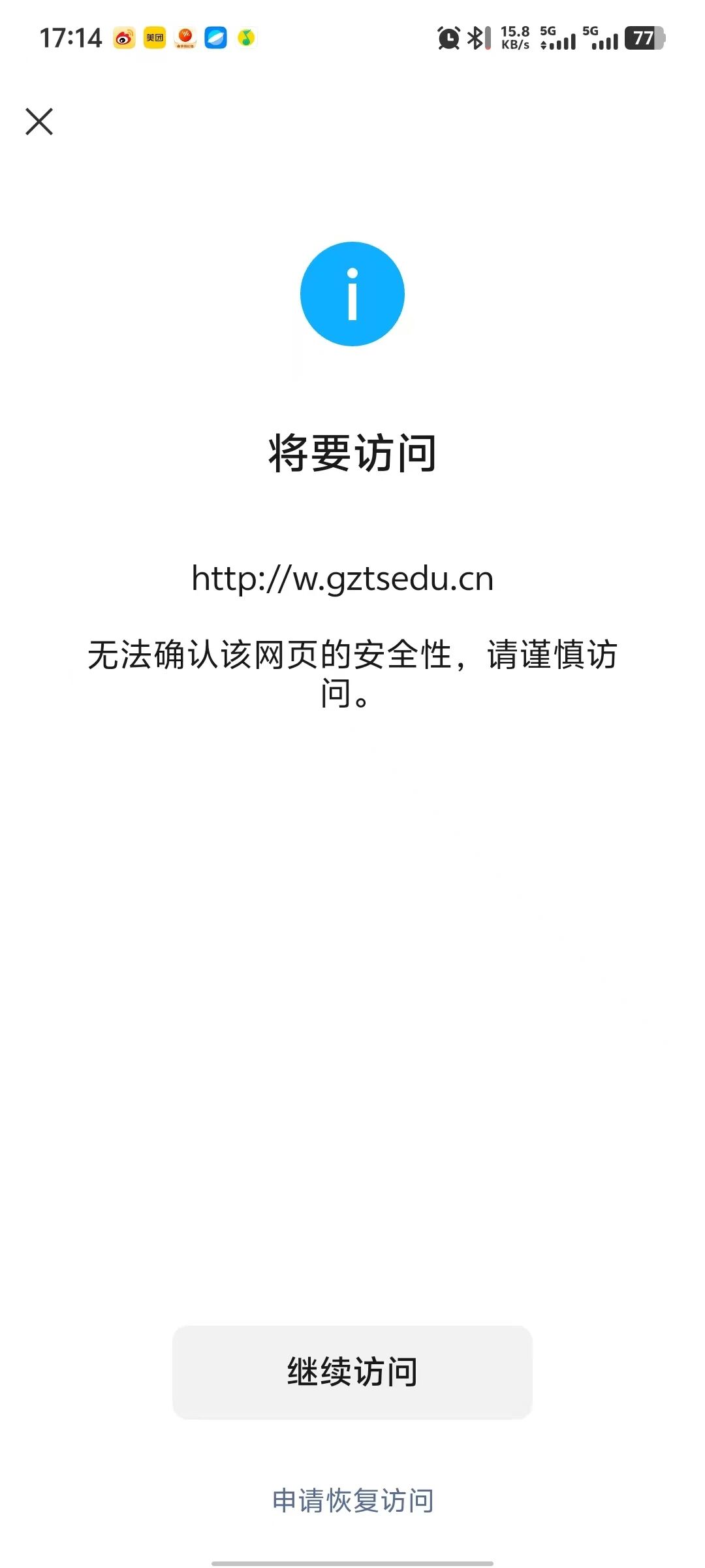 您好,域名gztsedu.cn在阿里云备案通过,http://w.gztsedu.cn/浏览器访问正常,我是网站开发者,访问时间如图2026/2/9,点开网址提示“无法确认该网页的安全性,请谨慎访问。”经检查网页里没有不安全的内容,请核实后帮忙解除拦截,谢谢!尽快处理,急急急,现在需要打开使用,谢谢!