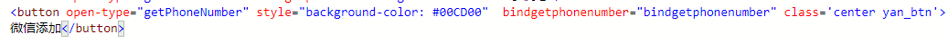 <button open-type="getPhoneNumber" style="background-color: #00CD00" bindgetphonenumber="bindgetphonenumber" class='center yan_btn'>微信添加</button>