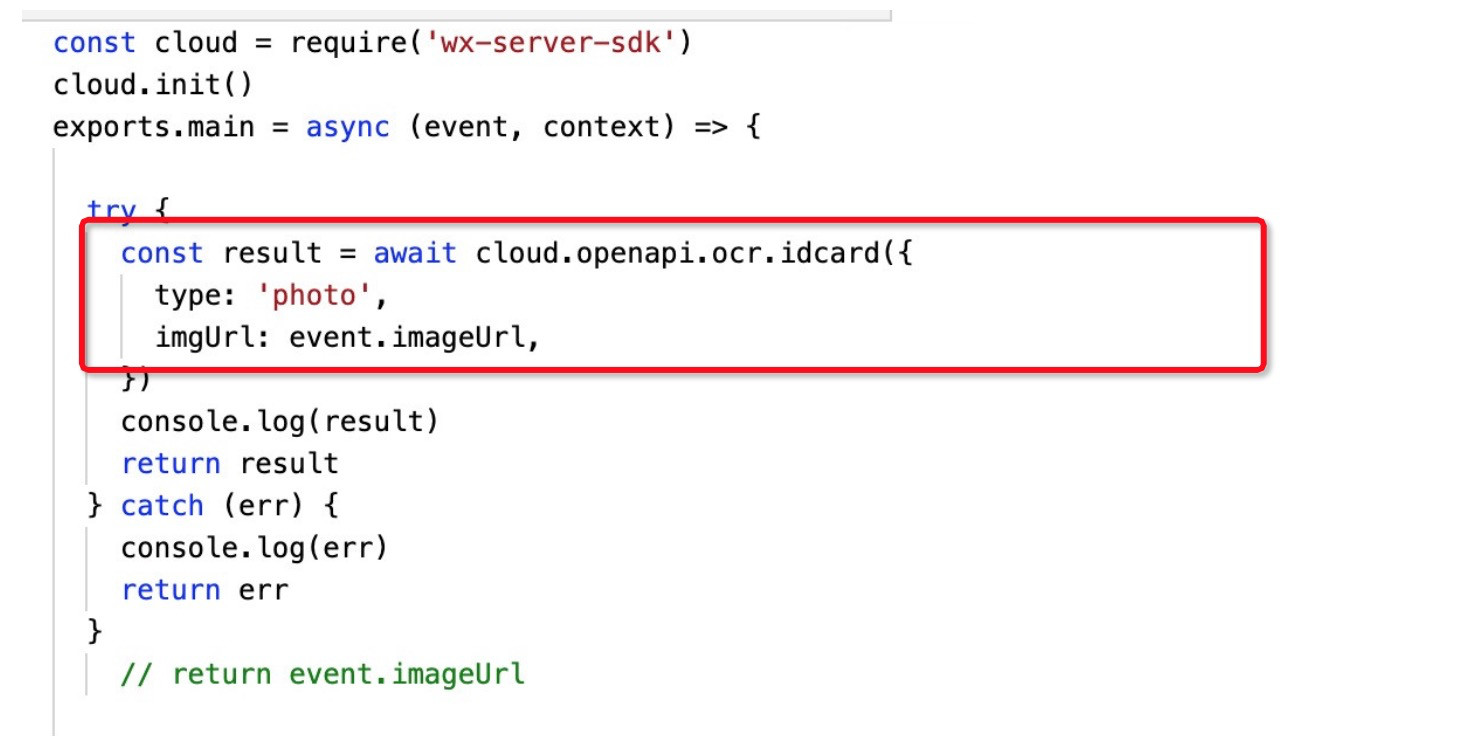小程序端wx.chooseImage({count: 1,sizeType: ['original', 'compressed'],sourceType: ['album', 'camera'],success(res) {console.log(res)let type = res.tempFilePaths[0].split('.').pop()wx.cloud.uploadFile({cloudPath: 'idcard.' + type,filePath: res.tempFilePaths[0]}).then(res=>{console.log(res.fileID)wx.cloud.callFunction({name: 'xxxxxxx',data: {fileID: res.fileID},success(r) {console.log(r)},fail(e) {console.log(e)}})})}})====================云函数端const result = await cloud.getTempFileURL({fileList: [event.fileID],})cloud.openapi.ocr.idcard({type: 'photo',imgUrl: result.fileList[0].tempFileURL})云函数是没问题的,我想问的是chooseImage 选了之后,把图片通过wx.cloud.uploadFile传到云服务,云服务为什么没返回图片地址,有的话就可以用ocr.idcard怎么去识别了