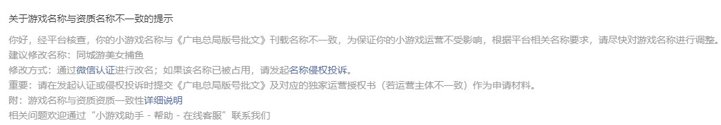 针对这个情况,我们希望再次说明下,在美女捕鱼小游戏创建之初我们是有使用《同城游美女捕鱼》的名称进行认证的,但是系统无法通过,于是我们有在社区进行发帖求助,并且最终在工作人员的帮助下确认了小游戏名称《美女捕鱼》,当时社区发帖的其中一个帖子链接:https://developers.weixin.qq.com/community/develop/doc/0000868ab100c0ad1c087ebfa56800?highLine=%25E7%25BE%258E%25E5%25A5%25B3%25E6%258D%2595%25E9%25B1%25BC