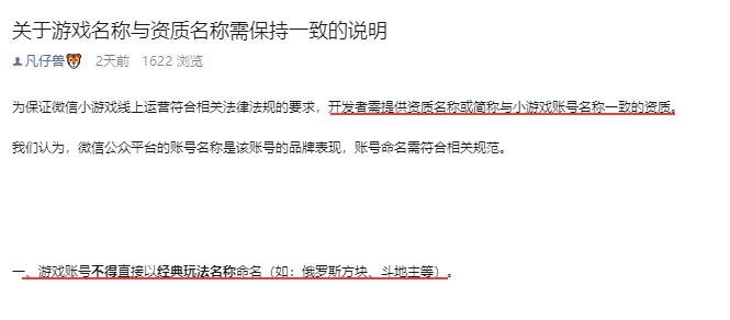另外官方周五发布的公告,“捕鱼”是经典玩法不得直接命名可以理解,但是《美女捕鱼》应该不算直接直接使用经典玩法命名吧;其次是我们资质文件上的简称,满足第一点"开发者需提供资质名称或简称与小游戏账号名称一致的资质"同时也满足第二点“不以经典玩法名称命名” ,所以这样理解下来,美女捕鱼应该是符合的吧
