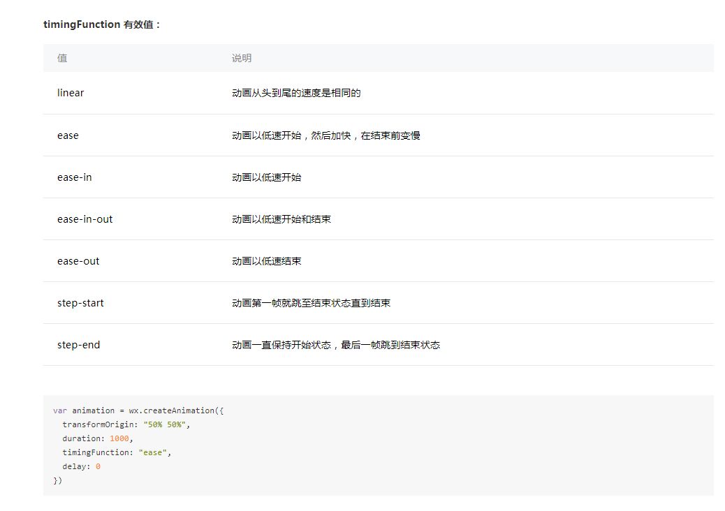 this.translateX = wx.createAnimation({ duration: 300, timingFunction: 'linear', }); this.translateY = wx.createAnimation({ duration: 300, timingFunction: 'ease-in', }); this.translateX.translateX(100).step(); this.translateY.translateY(100).step(); this.setData({ translateX: this.translateX.export(), translateY: this.translateY.export(), });
