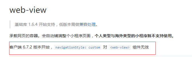 客户端 6.7.2 版本开始,navigationStyle: custom 对 <web-view> 组件无效