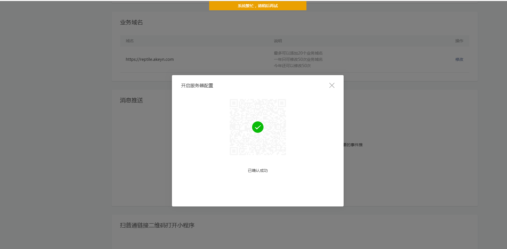 从上周开始,点击启动消息推送时,一直提示服务繁忙,其他帐号可以启动,麻烦官方帮忙看看。