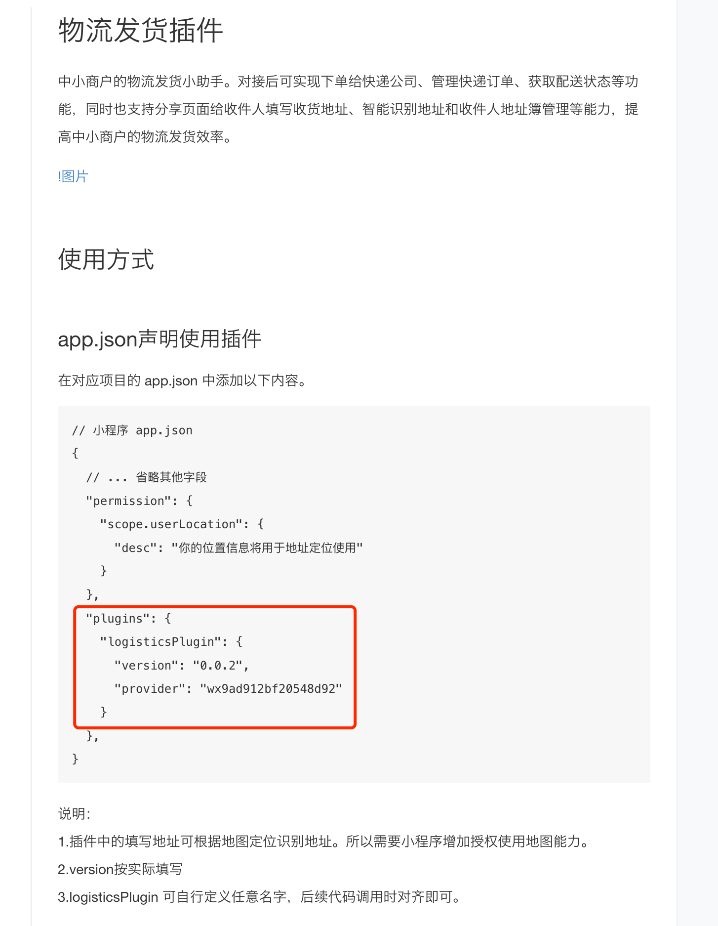 "plugins": { "logisticsPlugin": { "version": "2.2.28", "provider": "wx9ad912bf20548d92" } }物流组件的文档对我这种首次使用插件的来说很不友好。