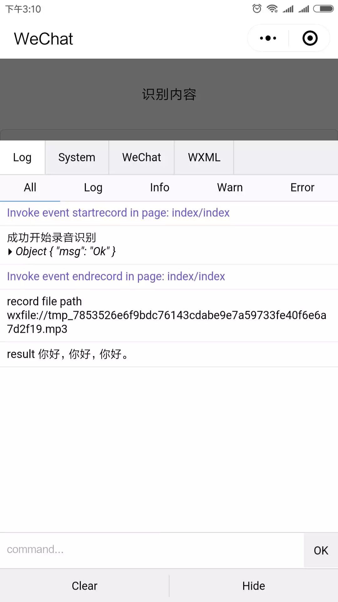 正常应该是“识别内容"会变成”你好,你好,你好。“,但是result值是改变了,但是显示内容并未改变(第一次录音会出现这种情况),目前小米、华为、红米会出现这种情况,微信版本6.7.2
