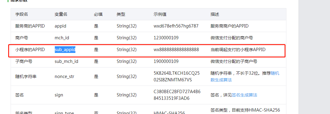 服务商的APPID应该是公众号的APPID,我们的服务商是在公众号那边申请的,sub_appid是子商户的APPID,也就是当前小程序的APPID,这个APPID应该是和子商户绑定了的