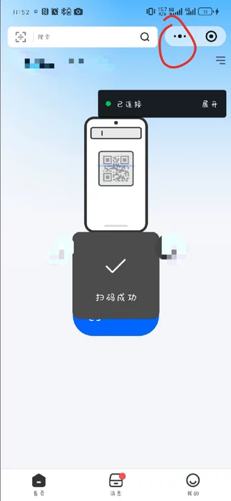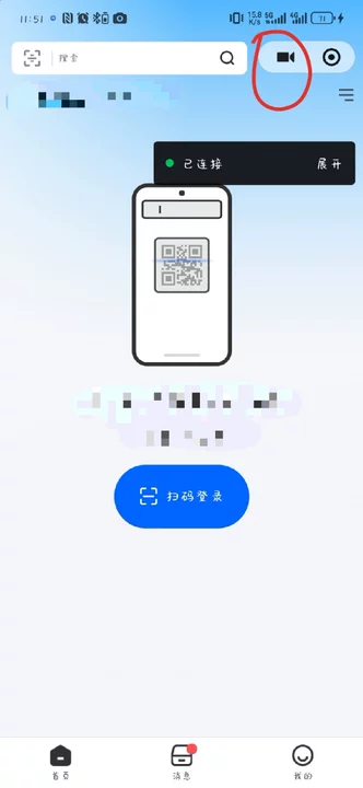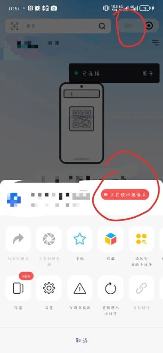 拉起扫码摄像头后,不扫码直接返回或点击扫码左上角的关闭按钮,右上角 “三个点” 会变成摄像头,点开就会看到 “正在使用摄像头” 的红色状态