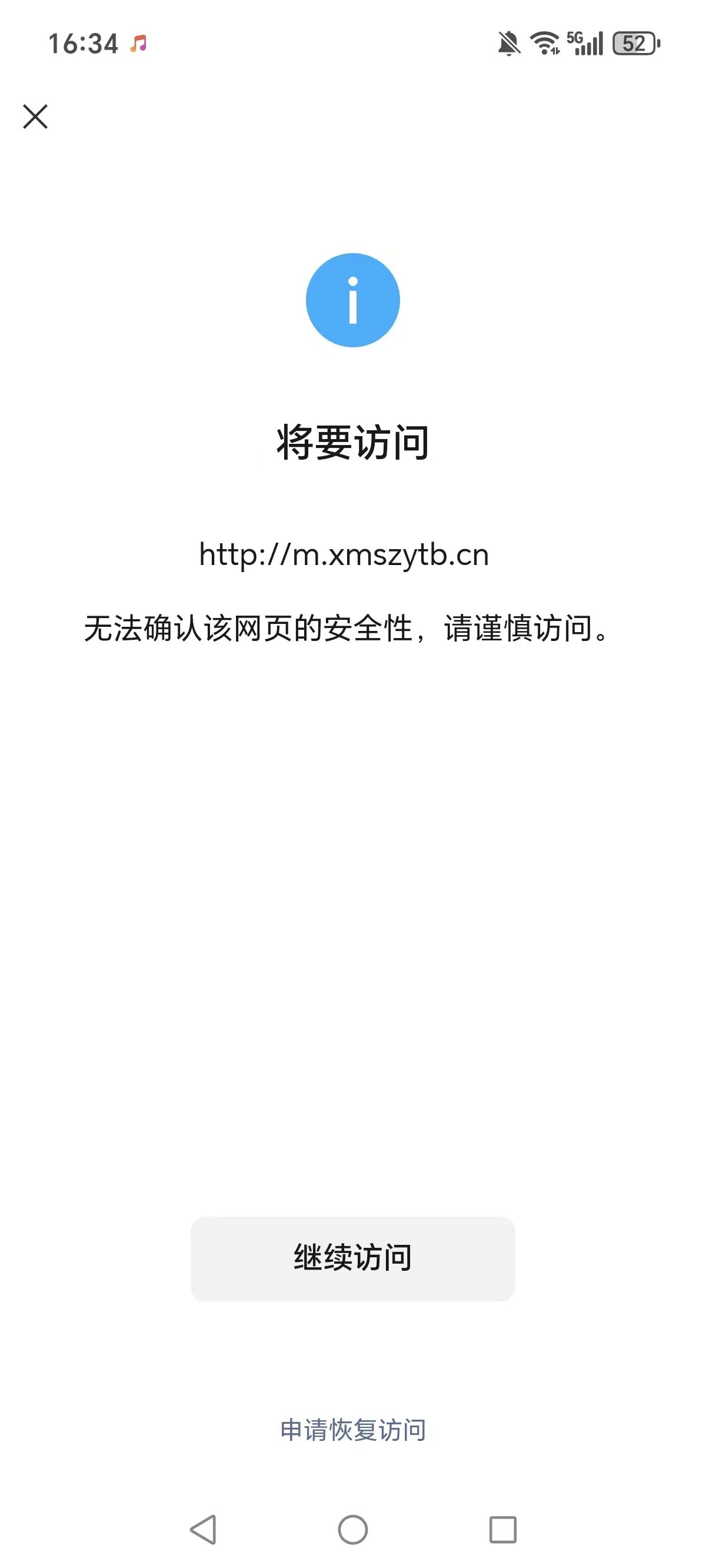 您好,域名xmszytb.cn在阿里云注册并备案通过,http://m.xmszytb.cn/浏览器访问正常,我是网站开发者,访问时间如图2026/2/6,点开网址提示“无法确认该网页的安全性,请谨慎访问。”经检查网页里没有不安全的内容,请核实后帮忙解除拦截,谢谢!尽快处理,急急急,现在需要打开使用,谢谢!