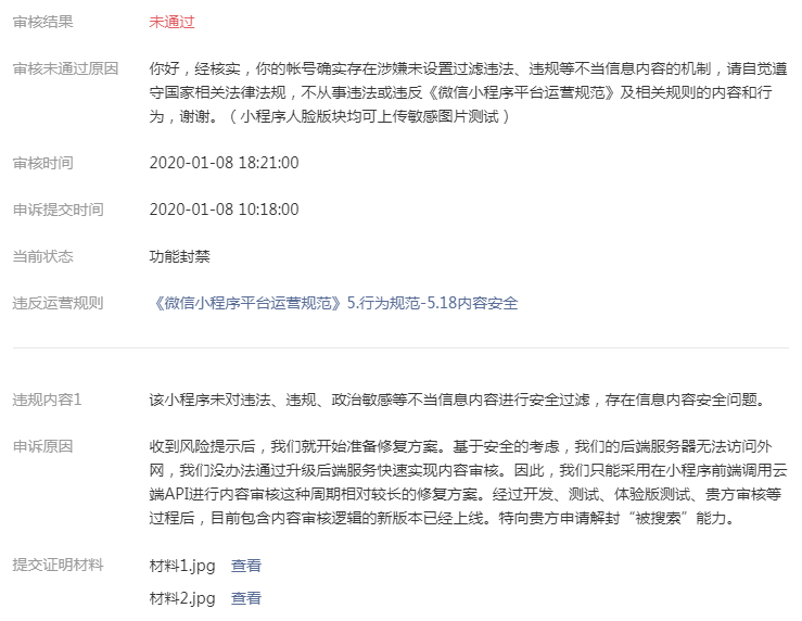 你好,经核实,你的帐号确实存在涉嫌未设置过滤违法、违规等不当信息内容的机制,请自觉遵守国家相关法律法规,不从事违法或违反《微信小程序平台运营规范》及相关规则的内容和行为(仍然可上传违规图片),谢谢。