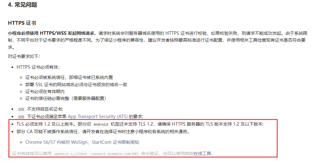 微信小程序原来是好的,更新域名证书点菜单就会报错,说TLS版本不对,但这个版本是哪里设置的呢,我服务器上的tomcat的connector已经关闭了TSL 1.0,1.1,只有TSL 1.2。域名证书如果不使用微信API,在普通web端又都是正常显示的,发证书方说其他应用程序也用这个证书,没有这个问题。
