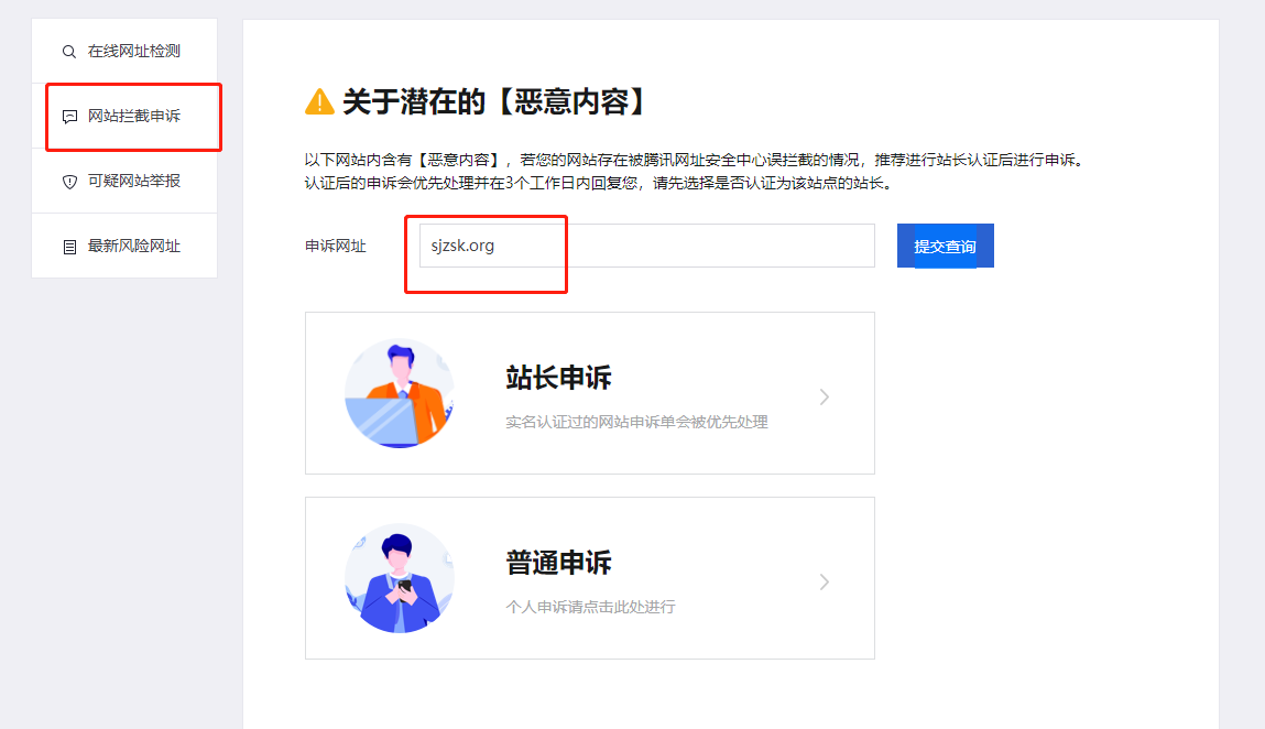你好,经核实域名被手机管家拦截,此处仅处理被微信暂停提供微信内直接访问的服务的外部链接的申诉问题,此服务不在受理范围,请登录手机管家官网【http://gj.qq.com/online_server/complain_url.html】自行申诉,知悉。