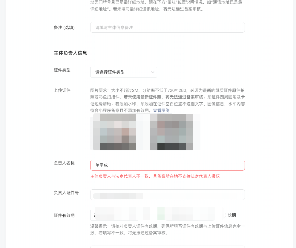 你好,当前备案地区不支持授权主体负责人,请核实当前填写信息是否为单位法定代表人,若不是请修改,若当前填写已是法人,但近期有做信息变更,企业工商数据更新可能有延迟,建议过段时间(5~15天工作日)再试。
