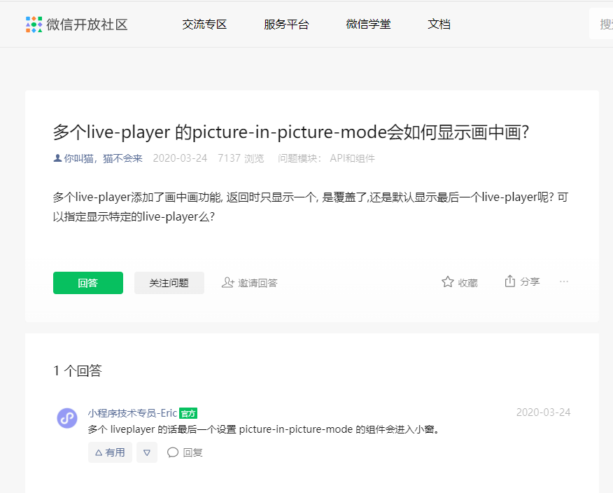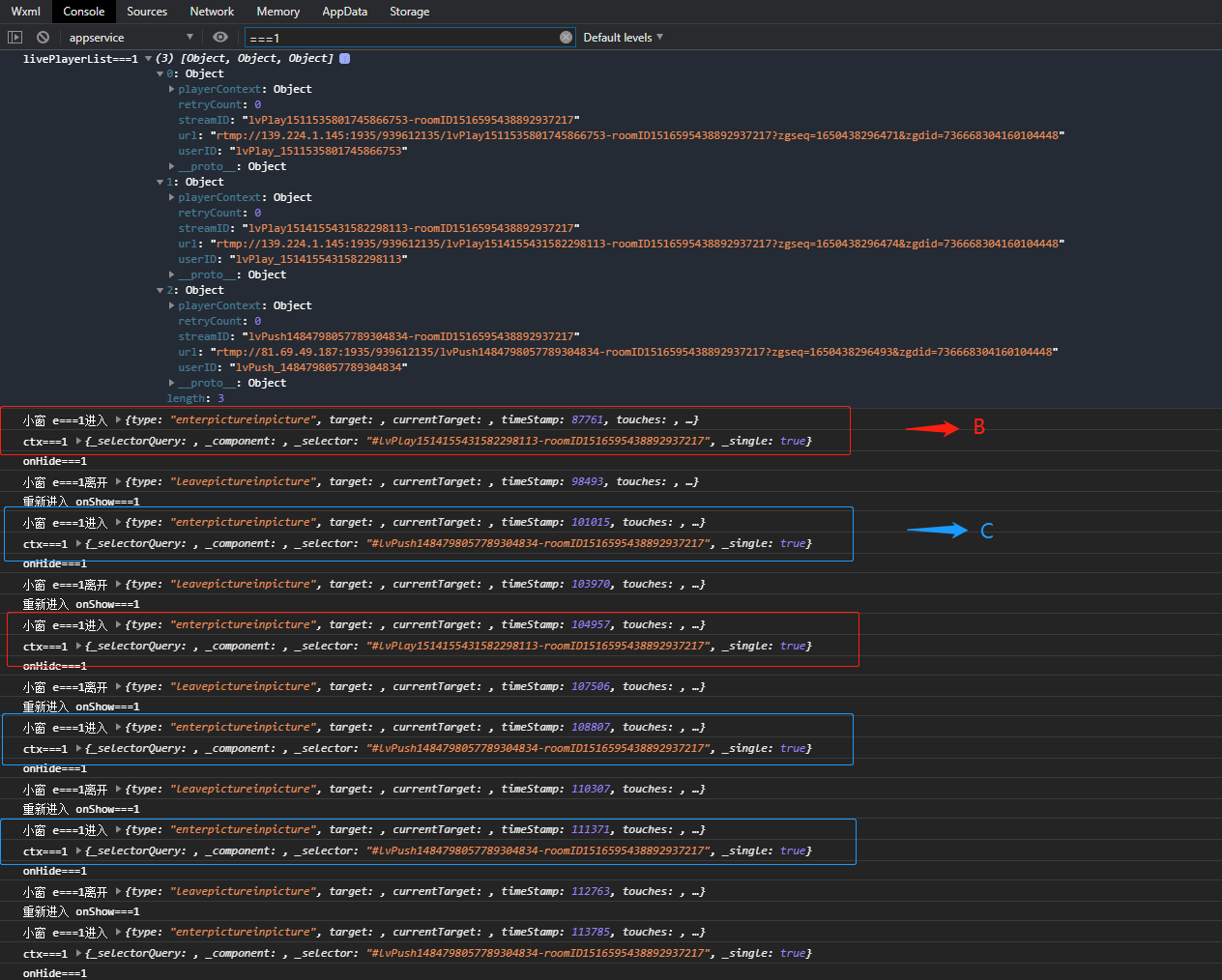 页面中使用直播组件 创建A B C 3个live-player并设置小窗模式后,用户在进入页面显示小窗时,显示逻辑是怎样呢?在搜索相关问题后找到官方人员回复,以最后一个设置 picture-in-picture-mode 的组件会进入小窗。 但是在具体测试时发现以最后设置picture-in-picture-mode进入小窗并不稳定,在按照顺序创建ABC 三个live-player并设置小窗模式后,用户初次进入页面小窗显示的为B的画面,返回上一层再次进入页面小窗才显示为C的画面。如此循环进出6次小窗分别显示为:B-C-B-C-C-C,在第四次为C的画面后,后续进出小窗才稳定输出C的画面。(提供两张截图以供参考)