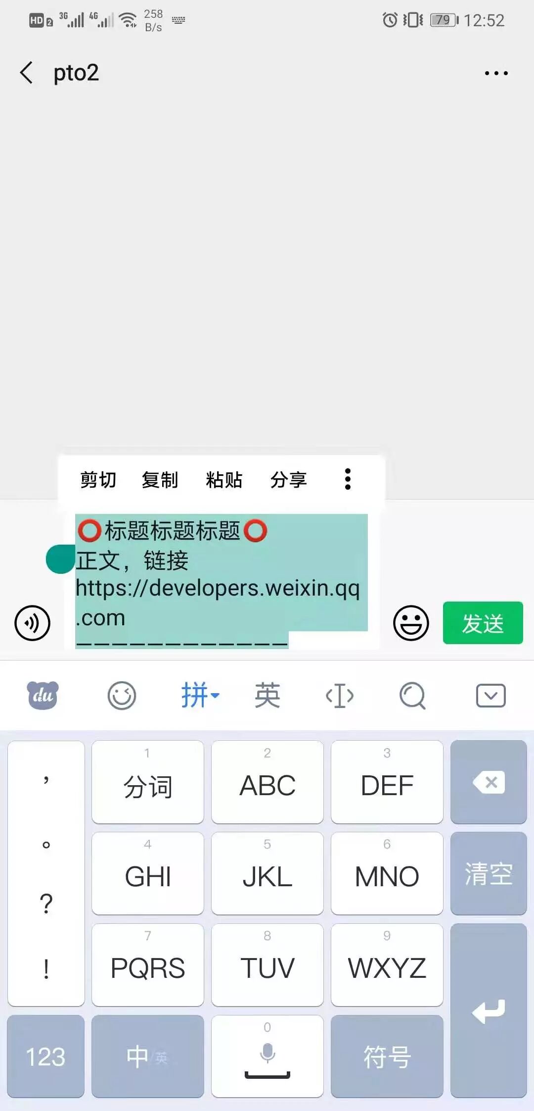 直接复制上述有问题的文本并粘贴到微信内发送,也不存在链接无法点击的问题。只有利用系统分享功能发出这样的文本时会出现问题。