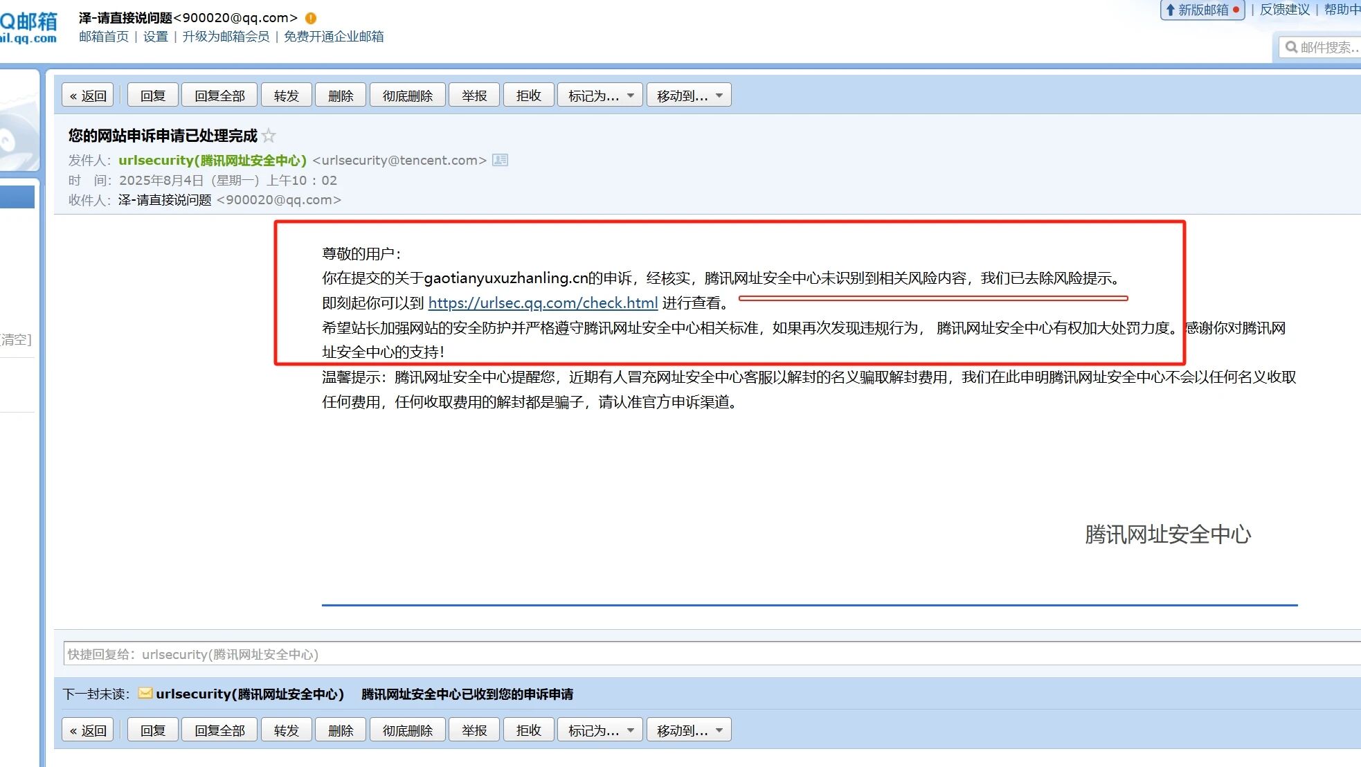 我司网站(域名:gaotianyuxuzhanling.cn)始终秉持合法合规运营原则,内容健康正向,绝无任何恶意欺诈或违规信息。近期被误拦截提示"包含恶意欺诈内容",经自查及第三方安全检测,确认系系统误判导致。我们坚决支持微信维护绿色上网环境的举措,并已加强网站安全防护。恳请贵方复核并解除拦截,恢复网站正常访问。如需提供备案号、安全检测报告等材料,我们将第一时间配合提交。期待尽快得到处理,感谢!