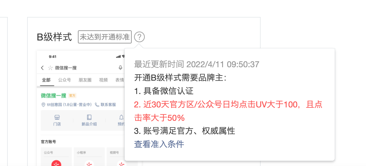 点击UV并且点击率大于50%,这些都是再说公众号的标准。但是公众号和小程序同名,小程序的点击率和点击UV都够了,开通官方区是公众号和小程序。为什么只算公众号的?这不合理吧?