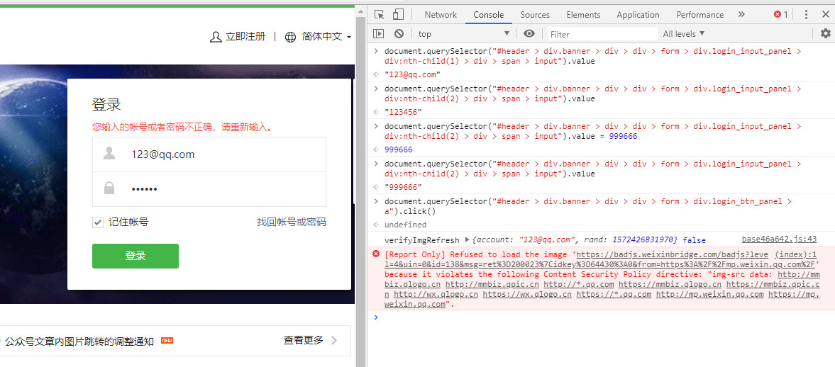 var search = search.split('?')[1];if(info[search]) {var nameEle = document.getElementsByClassName('weui-desktop-form__input')[0];var pasdEle = document.getElementsByName('password')[0];nameEle.value = '';setTimeout(function() {pasdEle.focus();pasdEle.value = '******';//document.getElementsByClassName('btn_login')[0].click();}, 500)setTimeout(function() {nameEle.addEventListener('keydown', function(e) {console.log(e.keyCode)})//模拟键盘输入for(var i = 0; i < info[search].length; i++) {cCode = info[search].charCodeAt(i);simulateKeyPress(nameEle, 'keydown', cCode, '0');console.log('cCode', cCode)}nameEle.focus();nameEle.value = info[search];if("createEvent" in document) {var evt = document.createEvent("HTMLEvents");evt.initEvent("change", false, true);nameEle.dispatchEvent(evt);} else {nameEle.fireEvent("onchange");}nameEle.fireEvent("onchange")console.log(info[search])}, 200)}document.querySelector("#header > div.banner > div > div > form > div.login_input_panel > div:nth-child(1) > div > span > input").value