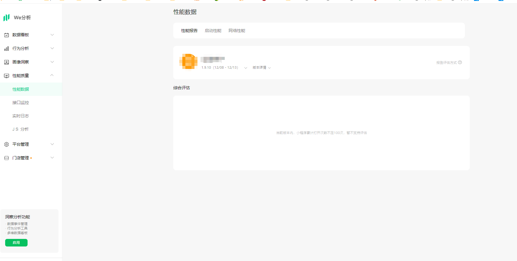 we分析 性能数据 选择按版本查询,显示异常,提示 当前版本内,小程序累计打开次数不足100次,暂不支持评估