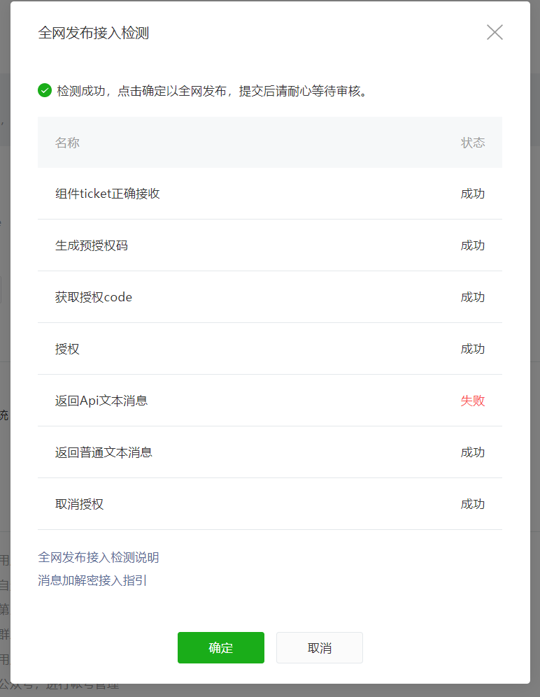 全网发布的时候一直报,返回Api文本消息失败。返回结果是 :{"errcode":-1,"errmsg":"system error hint