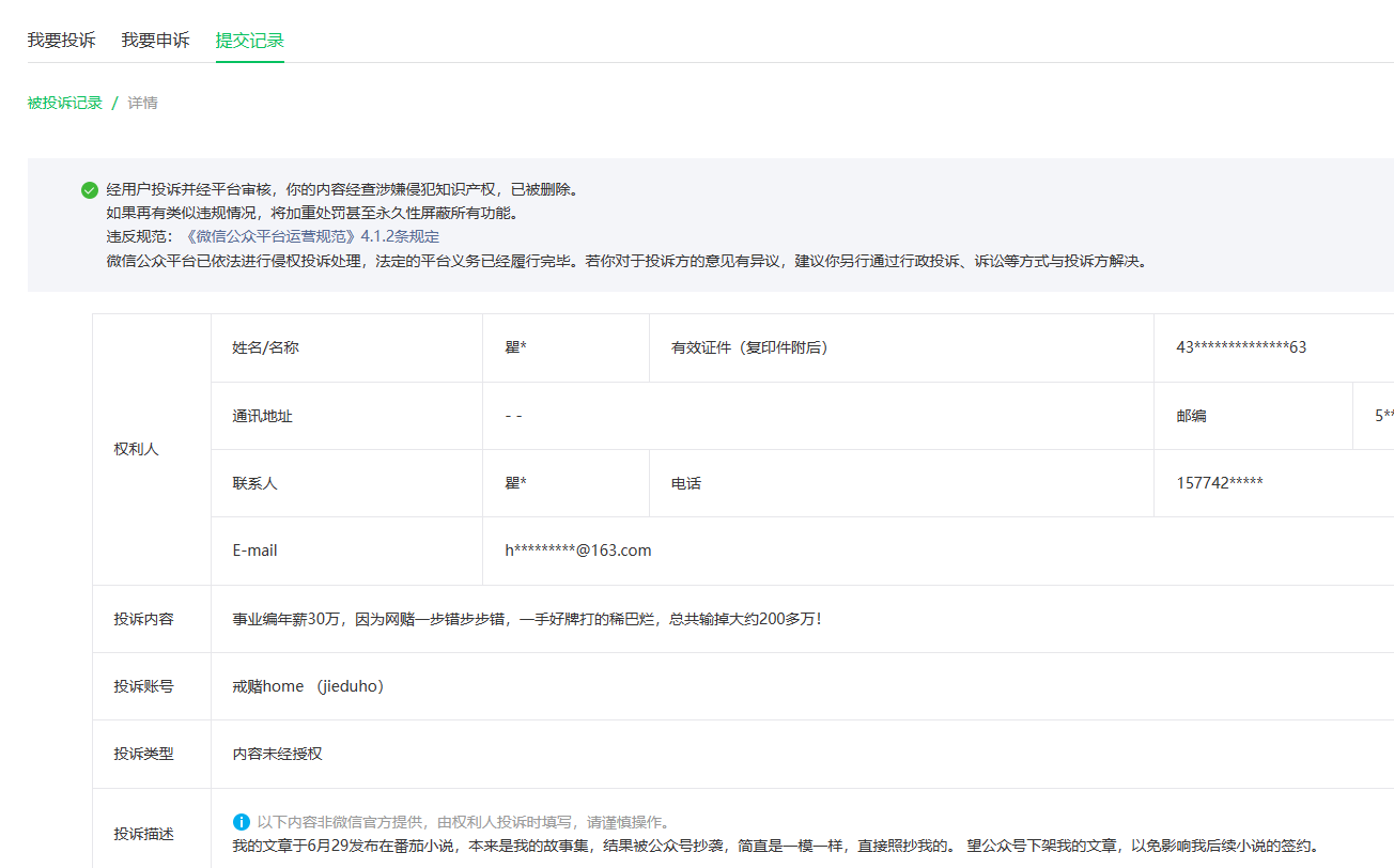 大哥,兢兢业业的,为你点赞,是原创吗?别人怎么就投诉成功?哦,我好像看到你的文章是投稿的,这就很难搞了