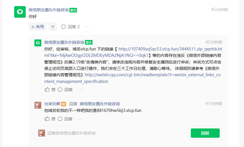 上次官方回复的链接域名非我提供域名