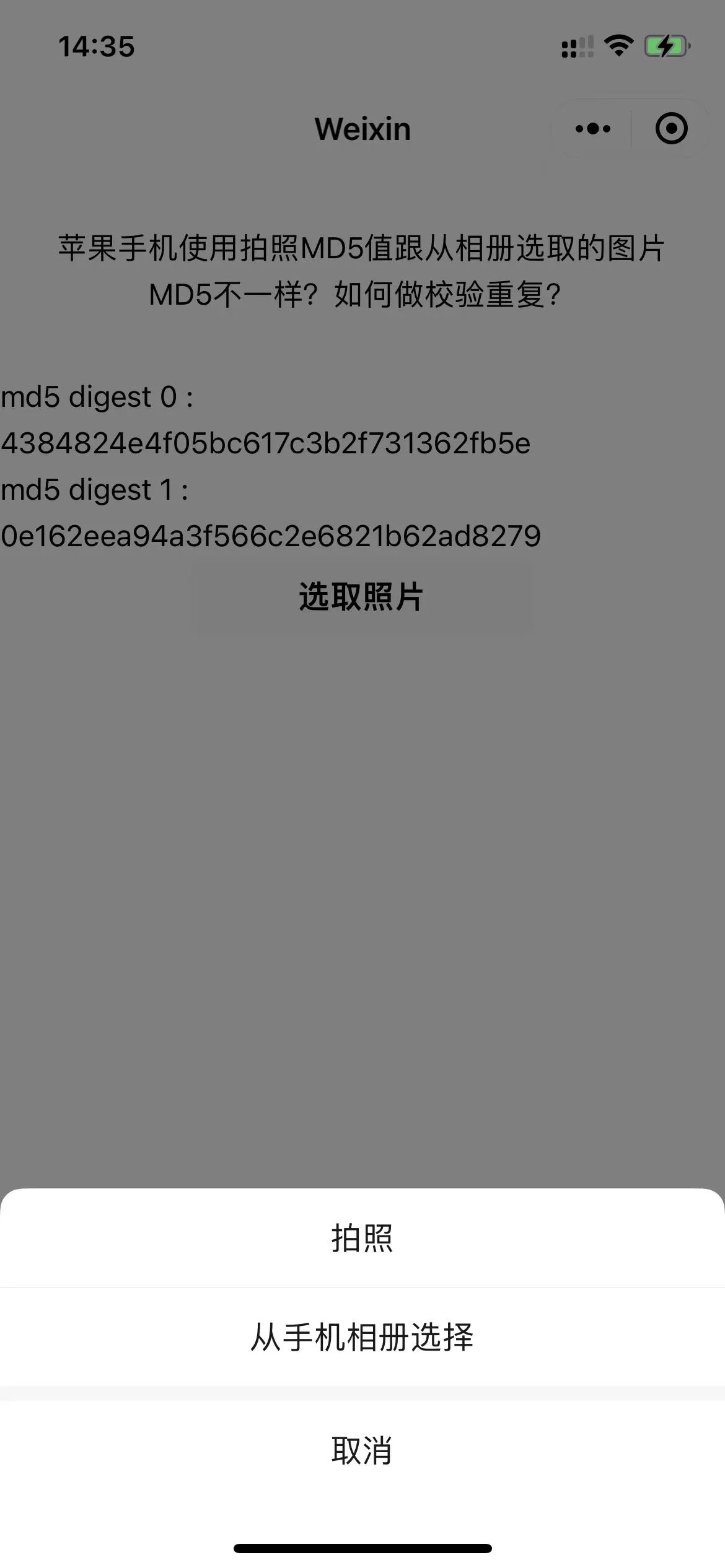 步骤,使用 wx.chooseImage 进行拍照。拍照成功后,选使用图片。这个时候 wx.getFileInfo获取 图片的MD5值 。 ,打开相册,发现图片存在相册,这个时候再次使用 wx.chooseImage 选择相册,选刚才拍照自动保存到相册的那张。获取图片MD5值,两个值不一样 导致无法做校验重复。。。 安卓手机 wx.chooseImage 进行拍照。拍照成功后,选使用图片。这张图片是不自动保存到相册的,所以不存在这个问题。。 所以这个 情况我应该 怎么去做校重呢?