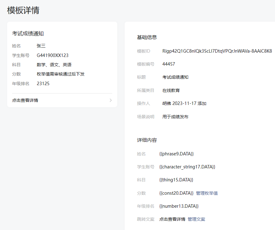 你这个模板枚举值--分数,是固定几个数通知的吗,是的话就就写分数值,比如60分,70分,80分、90分,要是分数不是固定值,就不要用枚举参数格式