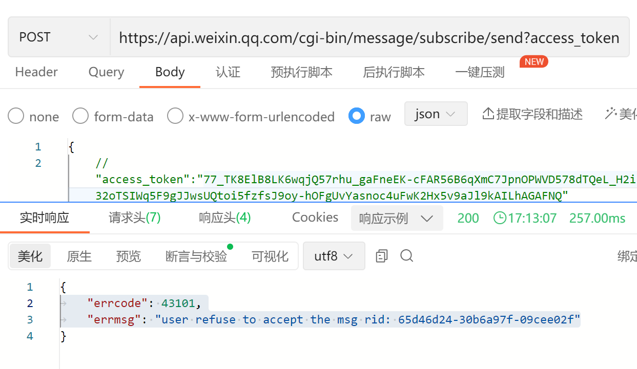 用postman调用api.weixin.qq.com/cgi-bin/message/subscribe/send,返回以下错误:
