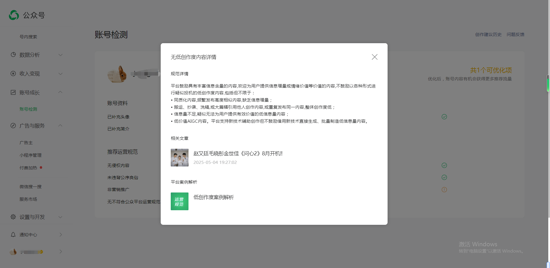 你好,经你们账号检测已经进行优化文章处理了几天,为什么还会一直展示已经删除的文章?麻烦帮忙看一下,谢谢 1.公众号原始ID:gh_dc21898cb862 2.被删除文章链接:https://mp.weixin.qq.com/s/dCwjKEIlaWWij5GEU8Kgow 3.当前检测页面完整截图。
