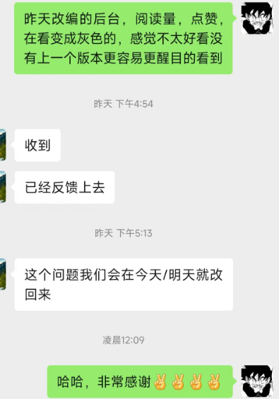 总结:【阅读量、点赞、在看】变为了灰色,【划线、留言】仍为以前的蓝色。所以,感觉并不是改版的目标之一,更像是无意改到了部分了代码造成的。