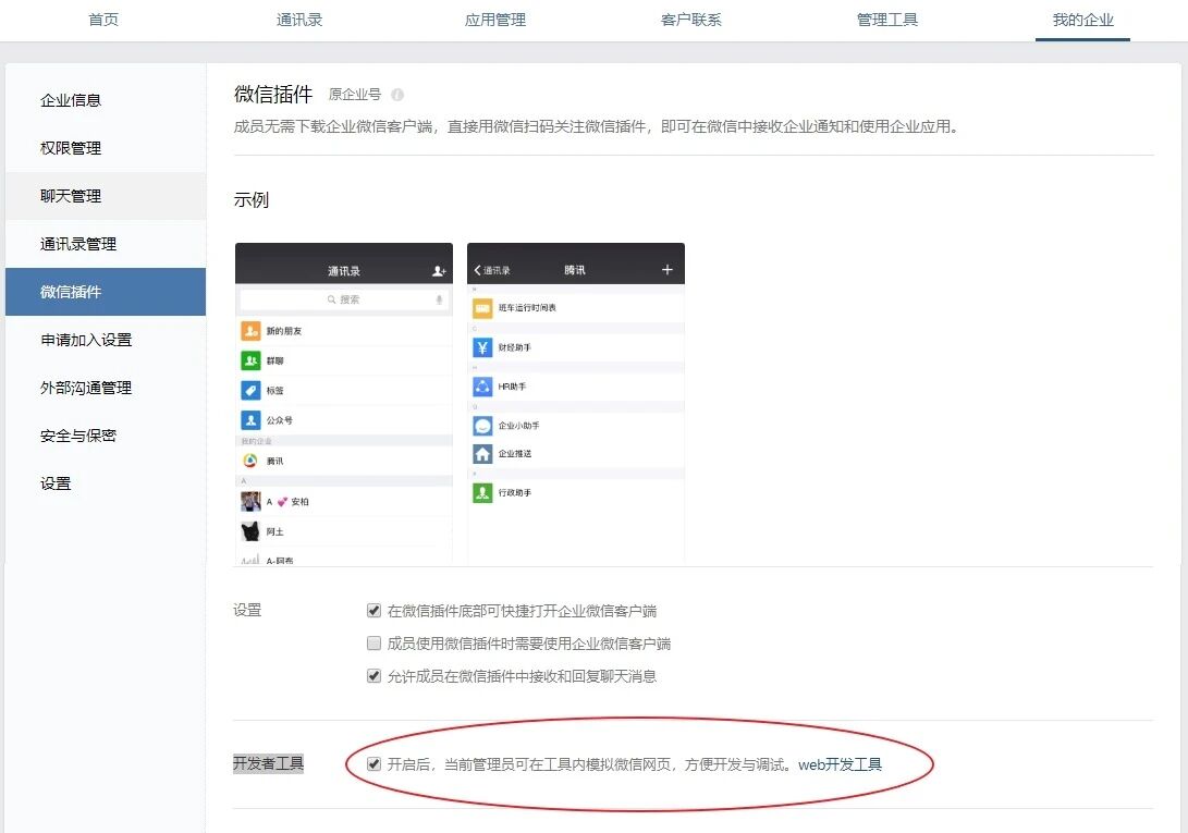 对。要在企业微信->微信插件->开发者工具那边勾选使用开发者工具。