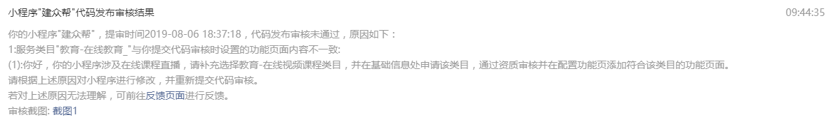 你好,经核实,贵方小程序最新提审版本:1.【推荐-直播】涉及在线课程直播,需补充选择教育-在线视频课程类目;2.【推荐-FM】涉及在线播放FM,还需补充选择文娱-FM/电台类目;3.类目资质详情参考:https://developers.weixin.qq.com/miniprogram/product/material.html