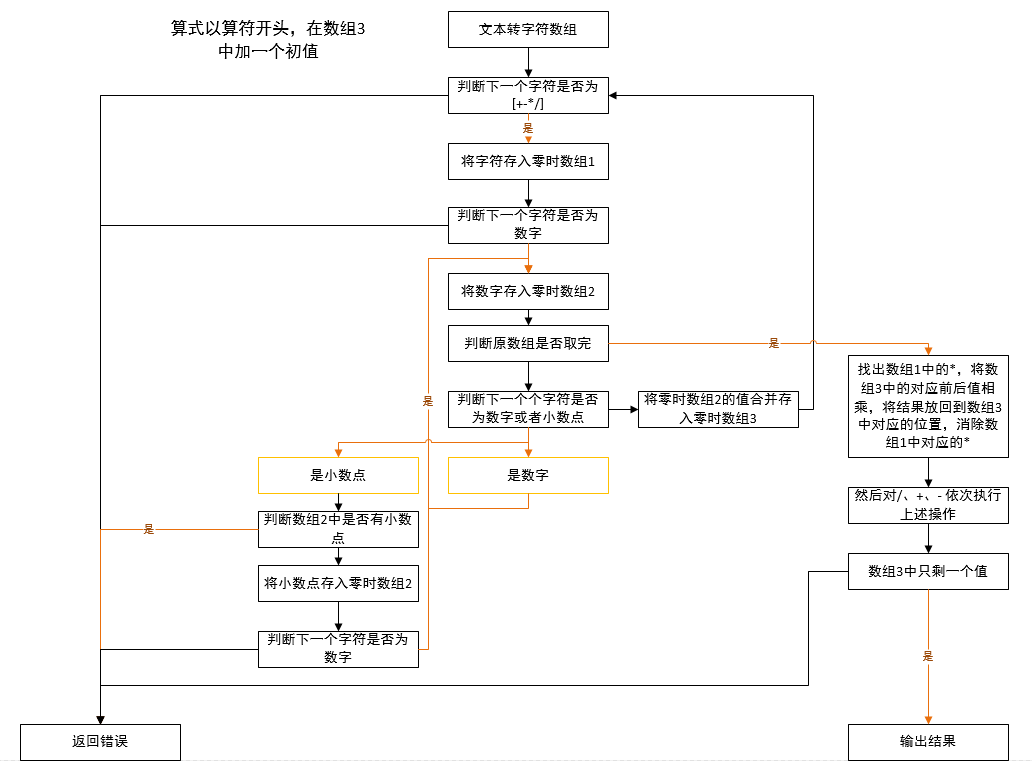理了理流程图,逻辑上感觉可以实现,但做的话比教复杂,这里我假设有初值。也可以假设没有,没有的话要调整下流程判断顺序。这里只考虑了四则运算,更复杂的算法就是更复杂的逻辑链,那就太难了……