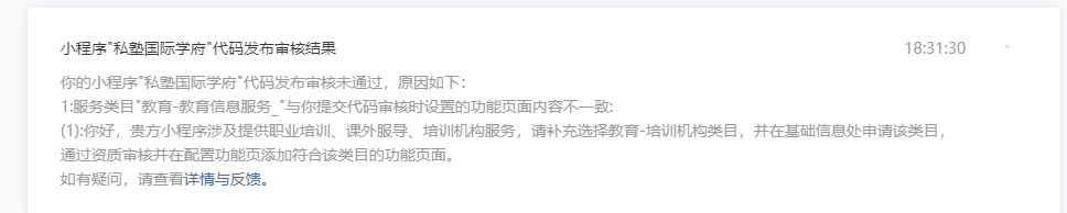 你好,经核实,贵方小程序暂不涉及提供培训机构服务,请重新提交代码审核。