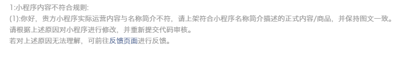 你好,经核实,贵方小程序实际运营内容仍与名称简介不符,请上架符合小程序名称简介描述的正式内容/商品,并保持图文一致,请修改后再提交代码审核。