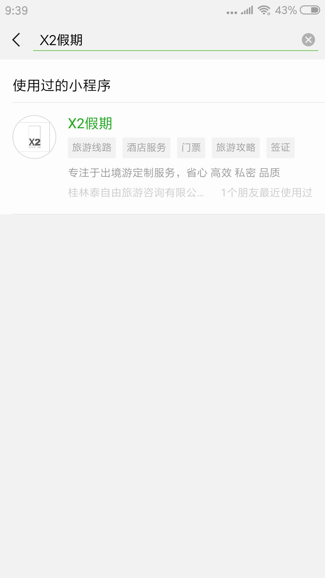 您好,小程序名称【X2假期】,在2018年7月12号已经成功发布上线,今天使用苹果系统的手机搜索小程序名称无法搜索到小程序,使用安卓手机可以正常搜索到并可以正常使用,如图,麻烦尽快处理一下。