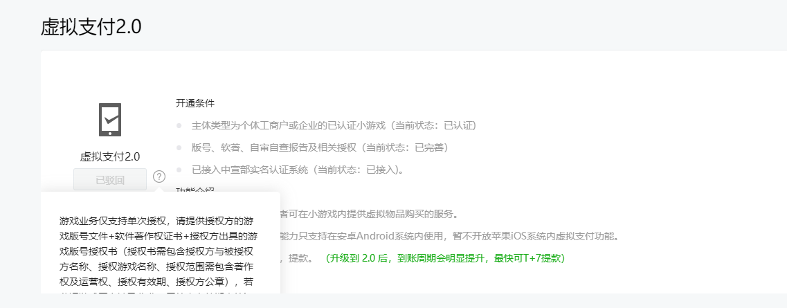 平台提示要签署虚拟支付2.0,按照要求填写完内容提交后,一直审核不通过,官方提示:请提供授权方的游戏版号文件+软件著作权证书+授权方出具的游戏版号授权书(授权书需包含授权方与被授权方名称、授权游戏名称、授权范围需包含著作权及运营权、授权有效期、授权方公章),若营运游戏平台涉及收费,需补充有效期内的icp许可证。麻烦问下,这些材料在哪里提交?一直找不到提交的地方,本身账号的资质认证是通过了的,求助,很急,懂的大佬帮忙解答下。