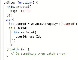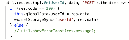 同步异步的问题 app.js getUserId: async function(data){ // 优先使用缓存数据 var cacheUid = wx.getStorageSync('userId') || this.globalData.userId || 0 if(cacheUid) { this.globalData.userId = cacheUid wx.setStorageSync('userId', cacheUid) return {code:200, userId:cacheUid, message:''} } // 缓存数据不存在,再请求接口,并缓存数据 var res = await util.request(api.GetUserId, data, 'POST') var uid = res.code == 200 ? res.data : 0 res.code != 200 && console.log('getUserId:', res.message); this.globalData.userId = uid wx.setStorageSync('userId', uid) return {code:res.code, userId:uid, message:res.message} } pages/test/test.js var app = getApp() onShow: async function() { var data = 'xxxxx' let {userId,message} = await app.getUserId(data) if (userId) { this.setData({ userId: userId, }) }else{ wx.showToast({ title:message, icon:'none', mask:true }) } }