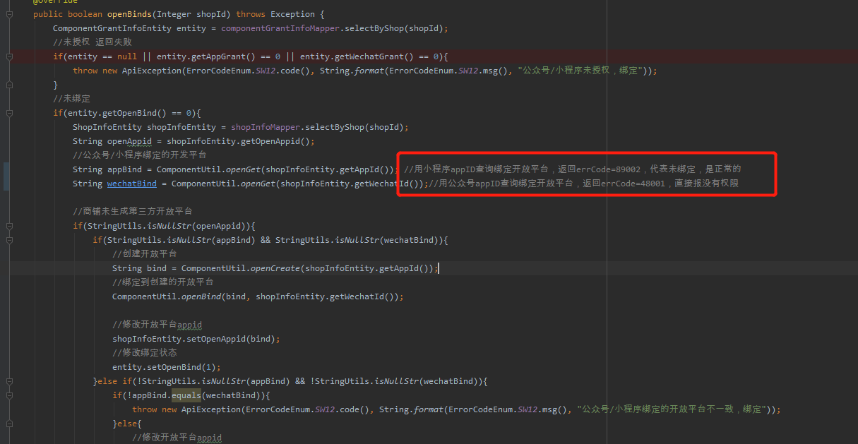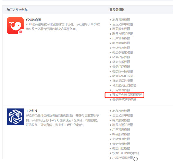 这个用户微信公众号授权了两个第三方平台,其中一个第三方平台已经有了开放平台权限,而这个开放平台权限只能给一个第三方平台,是互斥的,导致我们这个第三方平台没有权限