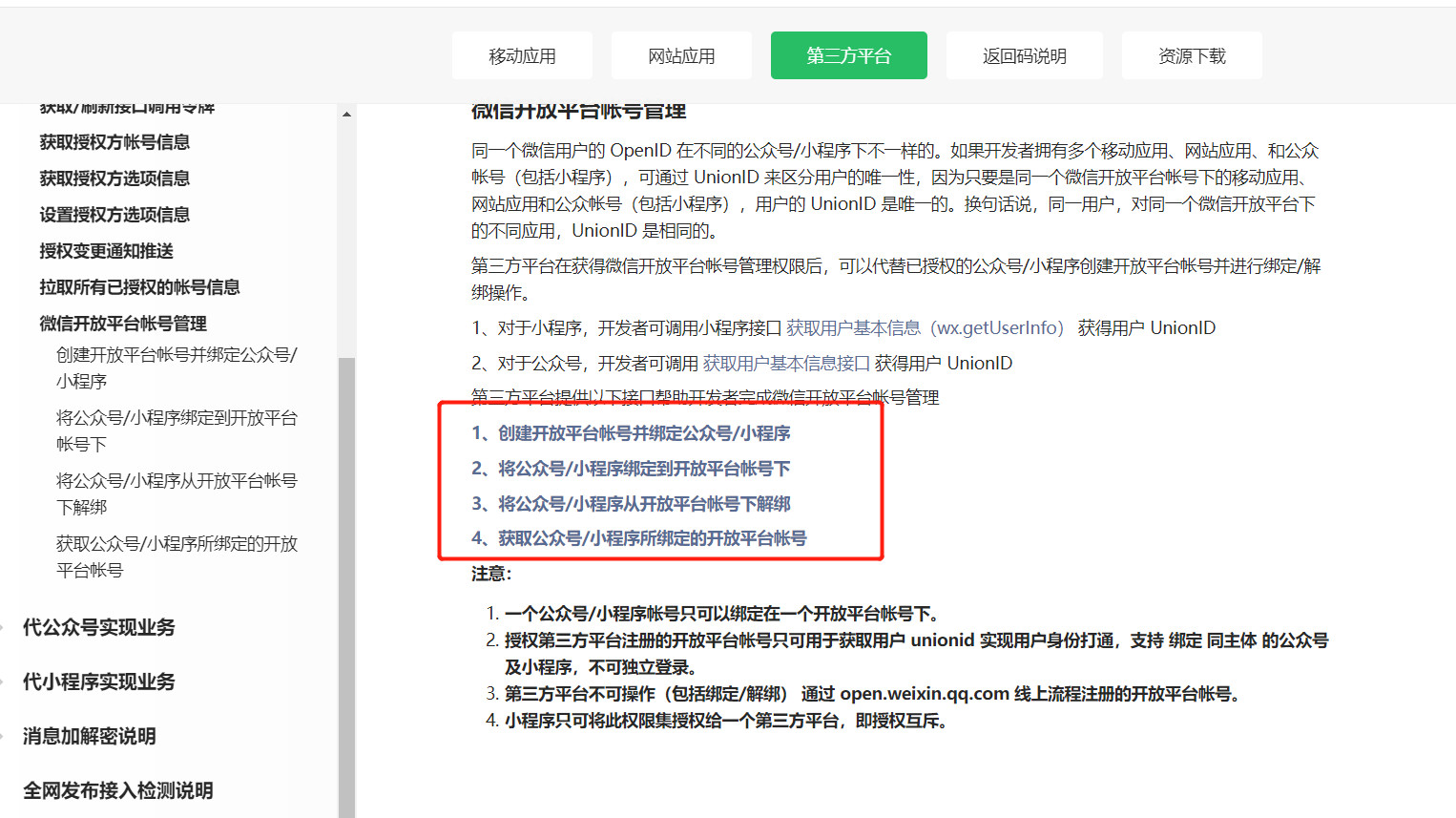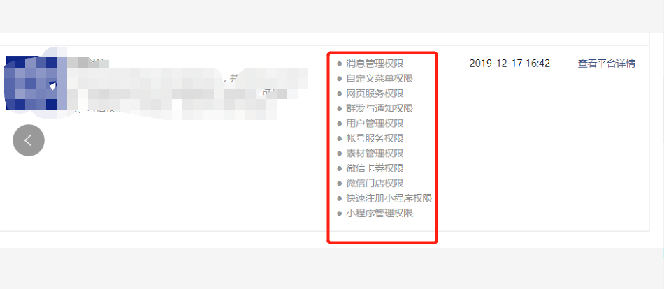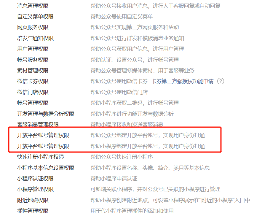 第三方平台的权限集都有(从报错内容来看,理论上就是下面这个权限没开通,但是已经开通了,只要在公众号授权了第三方平台,就ok了才对)