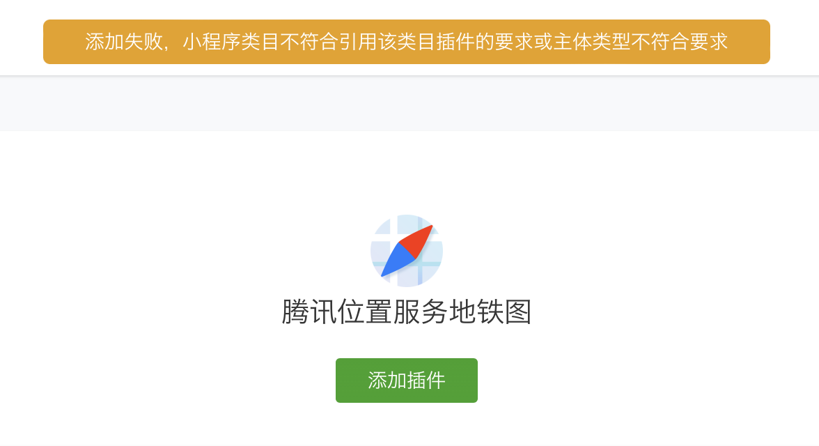 你好,经核实,appid:wxf29fed59853c3c4f 为【个人主体】类型,appid:wx6aaf93c4435fa1c1 插件的类目是【出行与交通-地铁】,该类目为【非个人主体】类型类目,小程序使用的插件,其插件类目不能超过小程序主体类型当前开放的范围,故该个人主体账号无法申请接入该插件