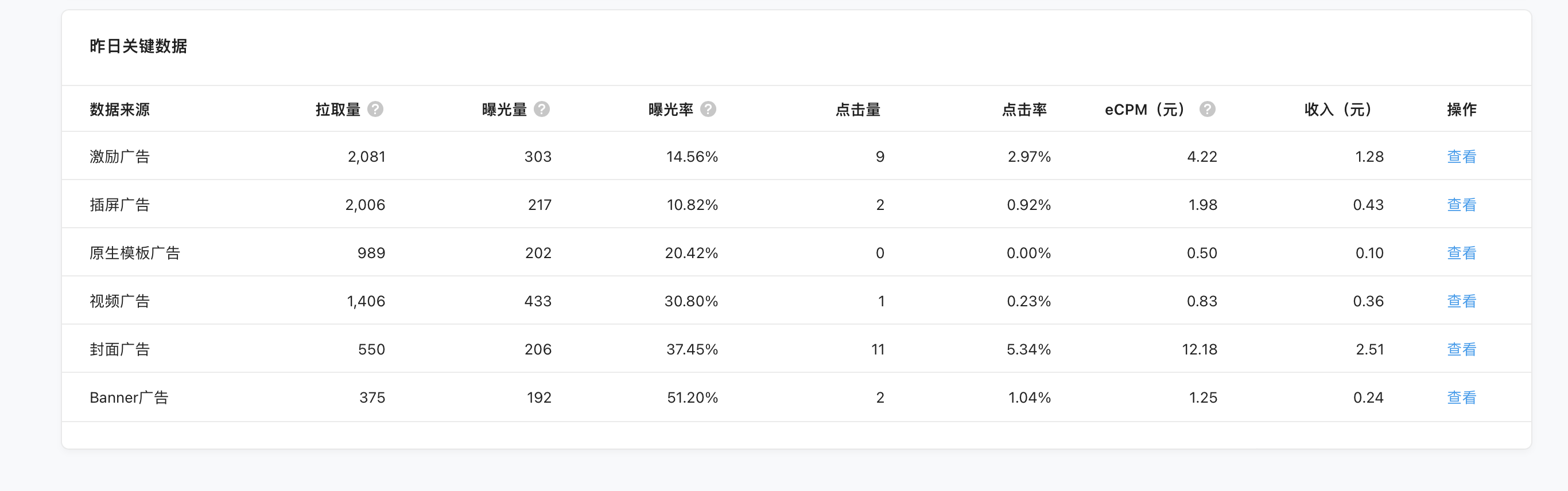 刚入行时,ecpm能有90多,现在都是一块两块钱,兄弟,听劝,等过几年行情恢复了再来做吧