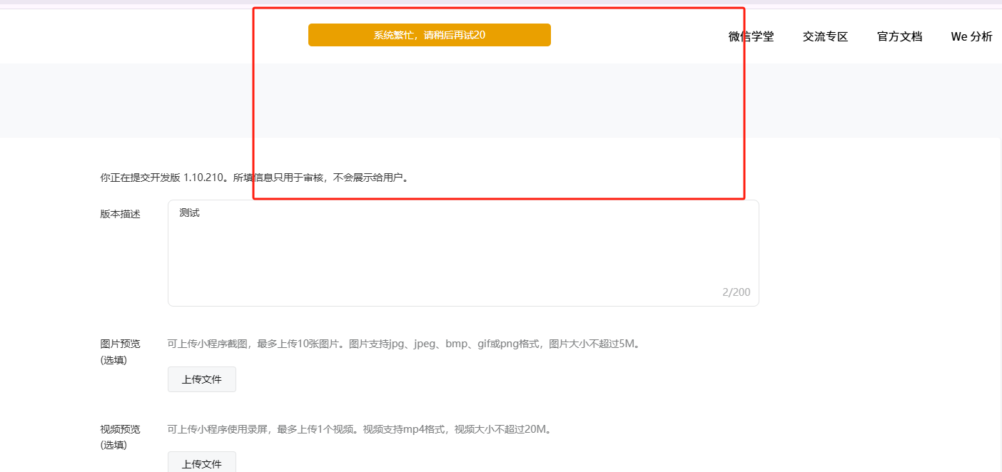 你好,小程序代码审核提审流程已恢复,建议重新尝试。根据上述反馈,无法提交审核建议:1.切换浏览器;2.清除浏览器缓存;3.重新上传代码包;4.参考小程序代码审核发布流程后,重新提交审核:https://developers.weixin.qq.com/community/develop/doc/000c040e8204a8241a5b6b22556809